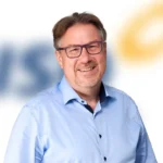A smiling man with glasses and a light blue shirt stands in front of a blurred background.